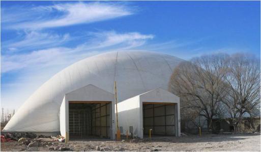 充气膜由内、外膜组成,可填充绝热材料,起到隔热作用。充气膜固定在屋顶或周围的地面结构上,利用送风系统使室内气压上升到一定的压力,使屋顶内外压差,以抵抗外力,创造巨大的建筑空间。由于采用气压支撑,钢缆作为辅助材料,无梁、柱支撑,具有温、湿度、洁净度等特点,能准确控制空气,这意味着大跨度建筑空间无梁、柱。