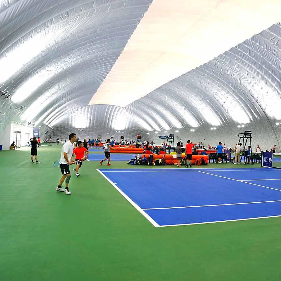 气膜网球馆内部结构无梁无柱,完成区域利用率100%,超大型区域,场地布置灵便无阻碍,气膜网球馆内部结构的压力、环境湿度、排风量等要素皆可人工调节,给予舒服怡人的室内空间。